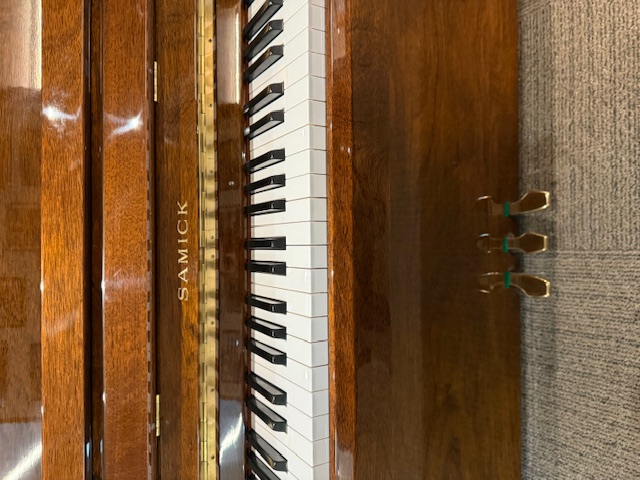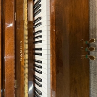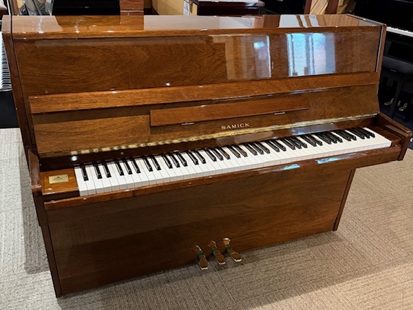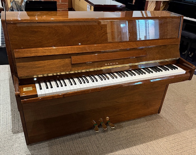 Excellent example of a Korean made piano incorporating German design . The small Samick upright has a sound and performance that would be expected from a larger piano due to the excellent design and the quality of the materials used. The piano is in a walnut polished case and is in excellent condition throughout.